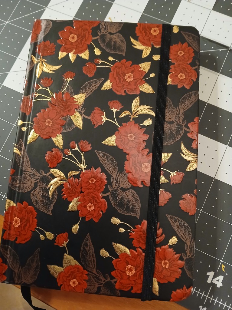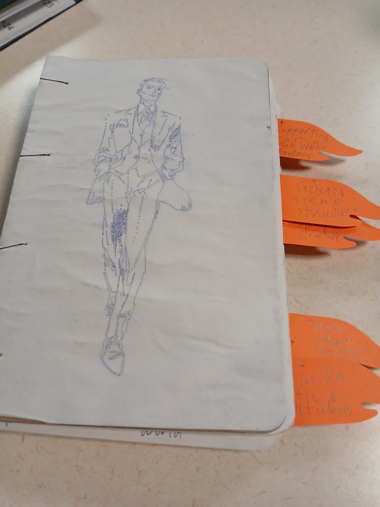 This is a coptic stitch, home-made notebook which I just finished filling up. Cover and interior pages are Rite in the Rain brand, which are suppose to be water resistant. Cover design was midjourney art turned in to line art on a transparent background, drawn by cricut machine. Water based marker, which was why the paper didn’t take the design well. I stapled some flame shaped note papers in as tabs, when it was mostly filled in.